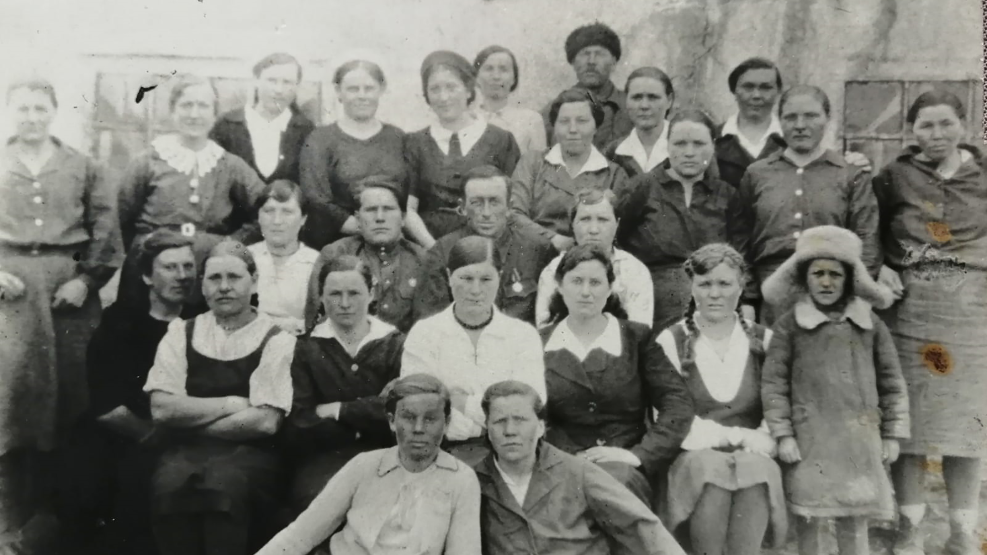 • Erntezeit in der Kolchose, Gebiet Karaganda während der Kriegsjahre. Der Achte von links ist Konstantins Großvater, Johannes Freund.