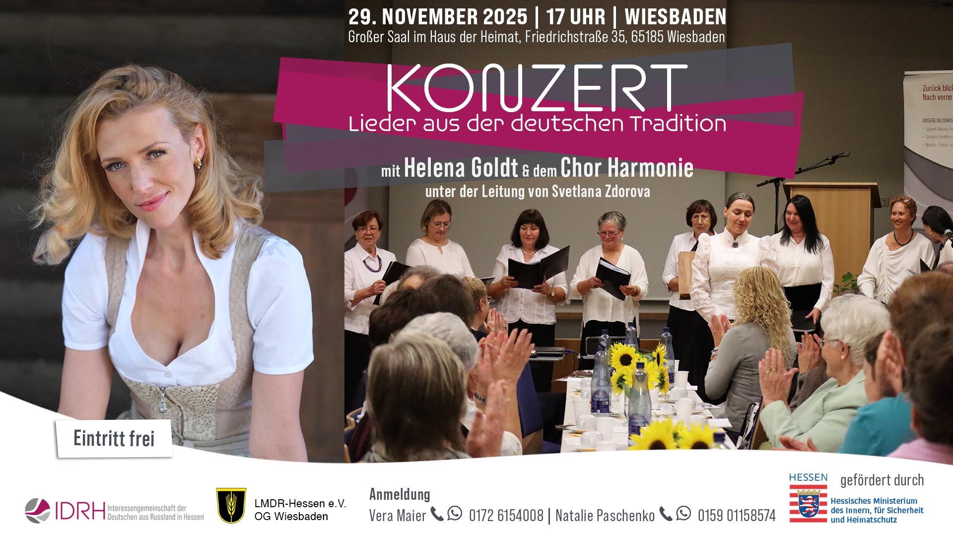 Wir laden Sie herzlich ein zu einem Konzert mit Liedern aus der deutschen Tradition – zum Zuhören & Mitsingen! Auf der Bühne begrüßen wir Helena Goldt und den Chor „Harmonie“ unter der Leitung von Svetlana Zdorova.