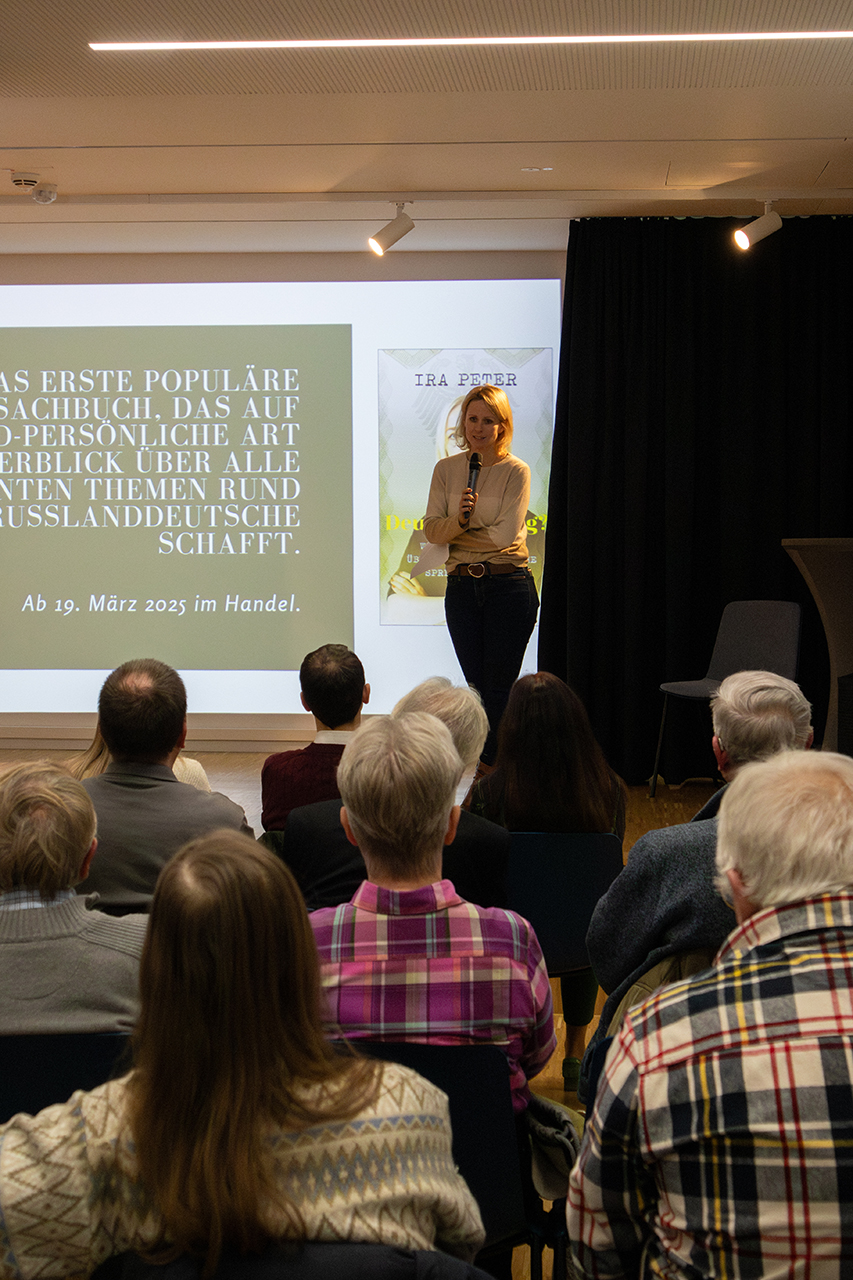 In ihrem gleichnamigen Buch räumt die Autorin Ira Peter mit gängigen Vorurteilen auf, etwa der Vorstellung, Russlanddeutsche seien durchweg russlandtreu oder integrationsfern. Mit Blick auf ihre eigene Migrationsgeschichte erzählt Ira Peter von Sprachverlust, von Scham, von Diktaturerfahrungen unter Stalin und Hitler, aber auch von gesellschaftlicher Vielfalt, Widerstandskraft und neuen Perspektiven.