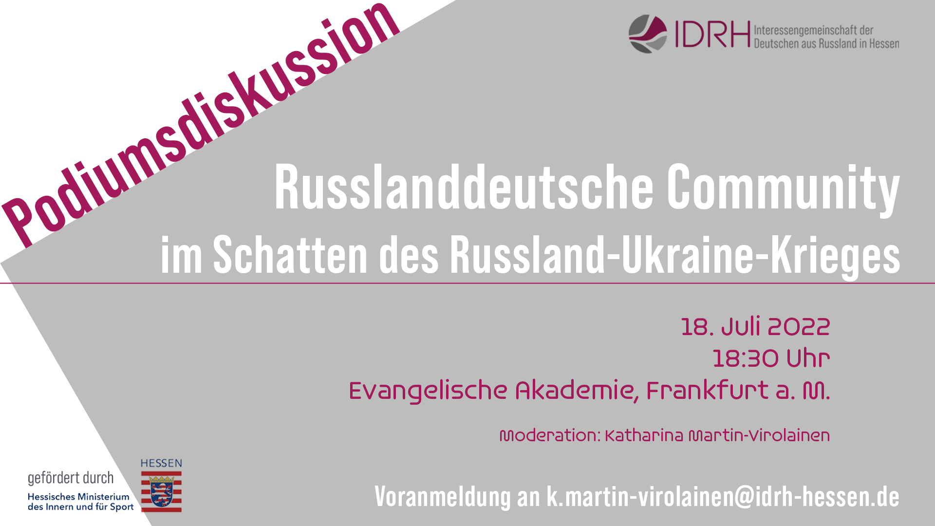 Der Angriffskrieg Russlands hat nicht nur verheerende Auswirkungen auf die Ukraine und die Schicksale der dort lebenden Menschen, sondern hat auch viele „Nebenwirkungen“, die unter anderem die russlanddeutsche Community und unsere Gesamtgesellschaft in Deutschland zu spüren bekommen. Darüber möchten wir am 20. Juni um 18.30 Uhr im Haus am Dom in Frankfurt mit Expertinnen und Experten aus den Bereichen Politik, Medien und bürgerliches Engagement ins Gespräch kommen.