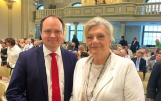 Festredner des Tages war der ehemalige Stadtpräsident von Breslau (2002-2018) Dr. Rafael Dutkiewicz, der mit seinen Ausführungen beeindruckte. Er rief in Erinnerung, Breslau sei die einzige europäische Stadt, deren Bevölkerung nach dem Zweiten Weltkrieg komplett ausgetauscht wurde. Alle deutschen Bewohner seien nach 1945 vertrieben worden. Breslau sei die Stadt der Vertreibungen und Versöhnungen. Heute sei die Stadt erneut eine Stadt der Vertreibung, sie habe Hunderttausende ukrainische Flüchtlinge aufgenommen. Europäisch sein – aus Vertreibung zu Versöhnung zu gelangen, das sei die Aufgabe. Russland sei unser gemeinsames Problem. Die Ukraine habe das Recht und die Pflicht, sich gegen Russlands Angriffskrieg zu verteidigen. Wir seien dazu verpflichtet, der Ukraine zu helfen, auch mit Waffenlieferungen. Eine Nation könne sich heute nur international verwirklichen.