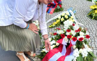 Im Anschluss an den Festakt legte Landesbeauftragte Ziegler-Raschdorf am Ehrenmal der Heimatvertriebenen, der „Ewigen Flamme“ am Theodor-Heuss-Platz, zur Erinnerung an die Millionen Opfer von Flucht und Vertreibung in Vertretung der Hessischen Landesregierung einen Kranz nieder. (Alle Fotos: LBHS)
